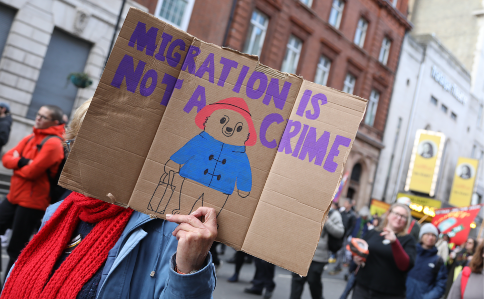 Днешната проява включваше шествие, речи в Уайтхол и музикално събитие на площад „Трафалгар“. Стотици започнаха да се събират още от сутринта, скандирайки силни послания: „Кажете го силно, кажете го ясно, бежанците са добре дошли тук“ и „Изберете любовта“. Плакатите също говореха открито — „Мигрантите съставляват нашата Национална здравна служба (NHS)“, „Не на расизма, не на Тръмп“ и „Бежанците са добре дошли, спрете крайната десница“.